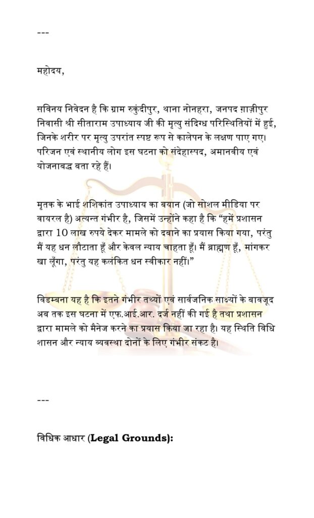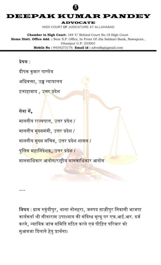 गाज़ीपुर। नोनहरा कांड में भाजपा कार्यकर्ता सीताराम उपाध्याय की मौत पर अब प्रदेश स्तर पर हलचल तेज़ हो गई है। इलाहाबाद हाईकोर्ट के अधिवक्ता दीपक कुमार पाण्डेय ने सबसे पहले प्रशासन पर 10 लाख देकर मामला दबाने का आरोप उजागर किया और पत्र लिखकर न्यायिक जांच, मुआवज़ा, सुरक्षा और सरकारी नौकरी की मांग उठाई।