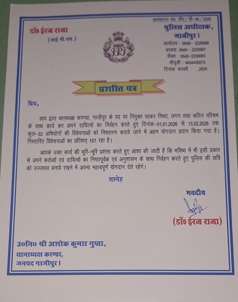 गाजीपुर। करंडा थाना के तेजतर्रार थानाध्यक्ष अशोक कुमार गुप्ता को पुलिस अधीक्षक डॉ. ईरज राजा द्वारा प्रशस्ति पत्र प्रदान किया गया। यह सम्मान 1 जनवरी 2026 से 15 फरवरी 2026 के बीच 33 विवेचनाओं के निस्तारण और 157% सफलता दर के लिए दिया गया। पुलिस अधीक्षक ने अपने प्रशस्ति पत्र में थानाध्यक्ष अशोक कुमार गुप्ता की निष्ठा, लगन और कठिन परिश्रम की सराहना की। उन्होंने कहा कि थानाध्यक्ष करंडा पद पर रहते हुए उन्होंने अपने दायित्वों का निर्वहन बखूबी किया है। पुलिस अधीक्षक ने आशा व्यक्त की कि भविष्य में भी वे इसी प्रकार कर्त्तव्यनिष्ठा और अनुशासन के साथ कार्य करते हुए पुलिस पुलिस की छवि को उज्जवल बनाए रखने में योगदान देते रहेंगे। एसओ अशोक कुमार गुप्ता ने हाल ही में आसमुहम्मद हत्याकांड का खुलासा करते हुए महज 12 घंटे में कर मुख्य आरोपी को गिरफ्तार किया था। इससे पहले रामपुर माझा थाना में रहते हुए उन्होंने 24 लाख 25 हजार रुपये के साथ दो जुआरियों को रंगेहाथ पकड़ा, लोग बताते हैं कि जिले में जुआ से संबंधित अभी तक सबसे बड़ा खुलासा इनके द्वारा किया गया था। करंडा थाना का पदभार ग्रहण करते ही उन्होंने अपराधियों को साफ चेतावनी दी थी, सुधर जाओ या क्षेत्र छोड़ दो। उनके इस कड़े रुख के कारण क्षेत्र में अपराधियों में डर का माहौल बना और थाना क्षेत्र में अपराधों पर कड़ा नियंत्रण स्थापित हुआ।