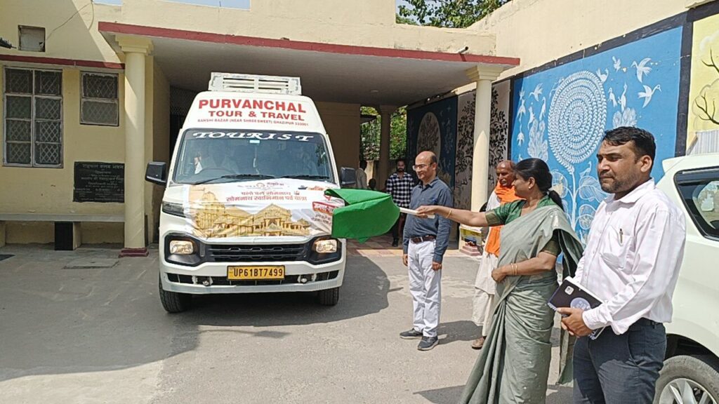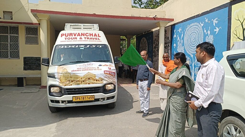 गाजीपुर। जिलाधिकारी अविनाश कुमार के निर्देश पर गाजीपुर से बहुप्रतीक्षित सोमनाथ यात्रा का भव्य शुभारंभ हुआ। 18 से 24 अप्रैल 2026 तक चलने वाली इस धार्मिक यात्रा को नगर पालिका अध्यक्ष सरिता अग्रवाल ने कलेक्ट्रेट स्थित रायफल क्लब परिसर से हरी झंडी दिखाकर रवाना किया। यात्रा के शुभारंभ के साथ ही परिसर में “हर-हर महादेव” के जयघोष गूंज उठे और माहौल पूरी तरह भक्तिमय हो गया। श्रद्धालुओं के चेहरे पर उत्साह साफ झलक रहा था, वहीं प्रशासन भी यात्रा को सुरक्षित और व्यवस्थित ढंग से संपन्न कराने में मुस्तैद दिखा।