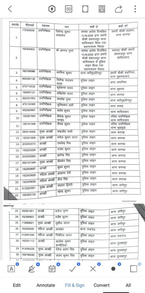 गाजीपुर। जिले में कानून व्यवस्था को और मजबूत करने के उद्देश्य से पुलिस विभाग में व्यापक स्तर पर प्रशासनिक फेरबदल किया गया है। एसपी डॉ. ईरज राजा ने शुक्रवार को कुल 71 पुलिसकर्मियों का स्थानांतरण किया है, जिनमें 11 उपनिरीक्षक, 31 मुख्य आरक्षी और 29 आरक्षी शामिल हैं।
