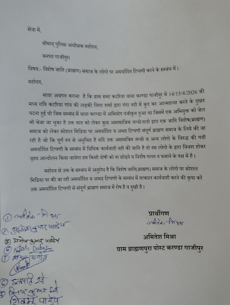 बताया जा रहा है कि 14/15 अप्रैल 2026 की मध्य रात्रि में कटरिया गांव की एक युवती ने गंगा नदी में कूदकर आत्महत्या कर ली थी। इस मामले में थाना करण्डा में मुकदमा दर्ज कर एक आरोपी को जेल भी भेजा जा चुका है। लेकिन घटना के बाद सोशल मीडिया पर शुरू हुई आपत्तिजनक टिप्पणियों ने माहौल को और अधिक तनावपूर्ण बना दिया है। ब्राह्मण समाज के लोगों ने इसे गंभीर मामला बताते हुए एसपी को प्रार्थना पत्र सौंपा है। प्रार्थना पत्र में साफ कहा गया है कि सोशल मीडिया पर की जा रही अभद्र टिप्पणियां न सिर्फ एक वर्ग विशेष को निशाना बना रही हैं, बल्कि समाज में वैमनस्य और तनाव पैदा कर रही हैं।