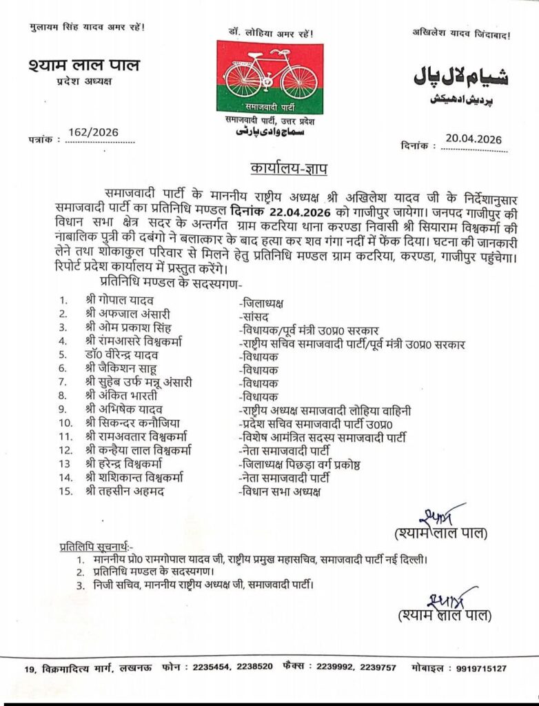 प्रार्थना-पत्र के मुताबिक, समाजवादी पार्टी द्वारा जारी विज्ञप्ति में जिस तरह नाबालिग के साथ दुष्कर्म के बाद हत्या और शव को नदी में फेंके जाने का आरोप लगाया गया है, वह न तो पीड़ित परिवार की शिकायत में दर्ज है, न ही पुलिस की एफआईआर में और न ही पोस्टमार्टम रिपोर्ट में इसकी पुष्टि हुई है। इसके बावजूद इस तरह के आरोपों को प्रचारित कर गांव में तनाव पैदा करने की आशंका जताई गई है। आशुतोष सिंह ने प्रशासन से मांग की है कि ऐसे भ्रामक और असत्य तथ्यों पर तत्काल रोक लगाई जाए और केवल वही जानकारी सार्वजनिक की जाए जो पुलिस अभिलेख और आधिकारिक रिपोर्ट में दर्ज है। उन्होंने यह भी कहा कि पीड़ित परिवार से मिलकर संवेदना जताना सराहनीय है, लेकिन गलत तथ्यों के सहारे लोगों को भड़काना और राजनीतिक लाभ लेना पूरी तरह अनुचित है।