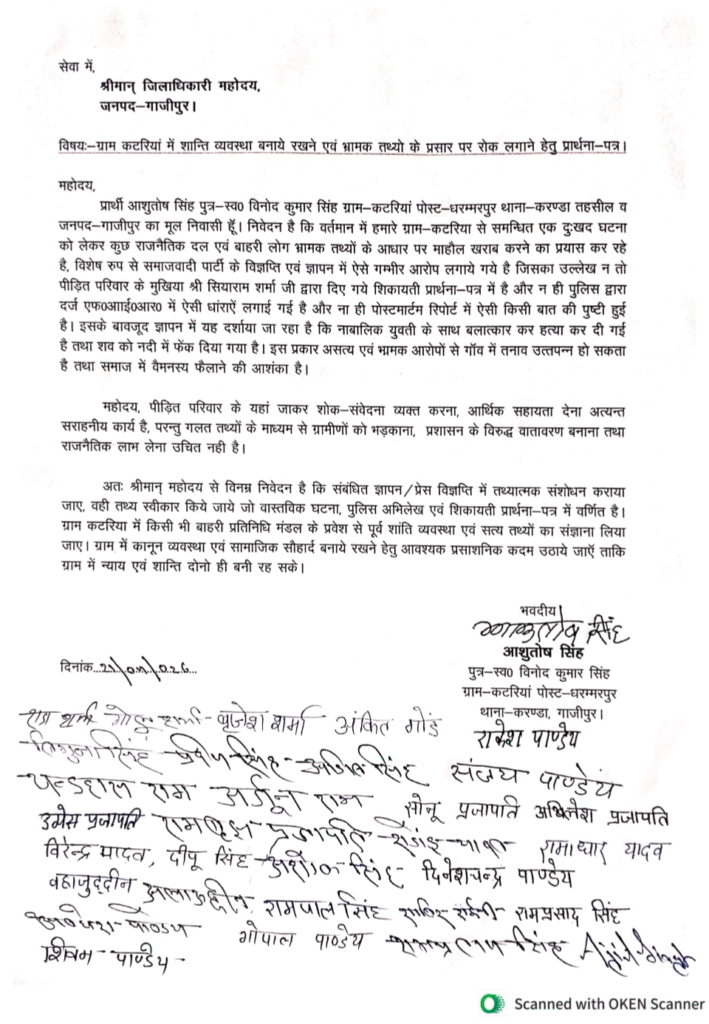गाजीपुर। करण्डा थाना क्षेत्र अंतर्गत कटरियां गांव में हुई एक दुखद घटना को लेकर अब सियासी बयानबाजी और भ्रामक प्रचार का मामला तूल पकड़ता जा रहा है। ग्राम प्रधान प्रतिनिधि आशुतोष सिंह के साथ ग्रामीणों ने जिलाधिकारी को प्रार्थना-पत्र देकर गंभीर आरोप लगाया है कि कुछ राजनीतिक दल और बाहरी लोग तथ्यहीन बातें फैलाकर गांव का माहौल खराब करने की कोशिश कर रहे हैं।