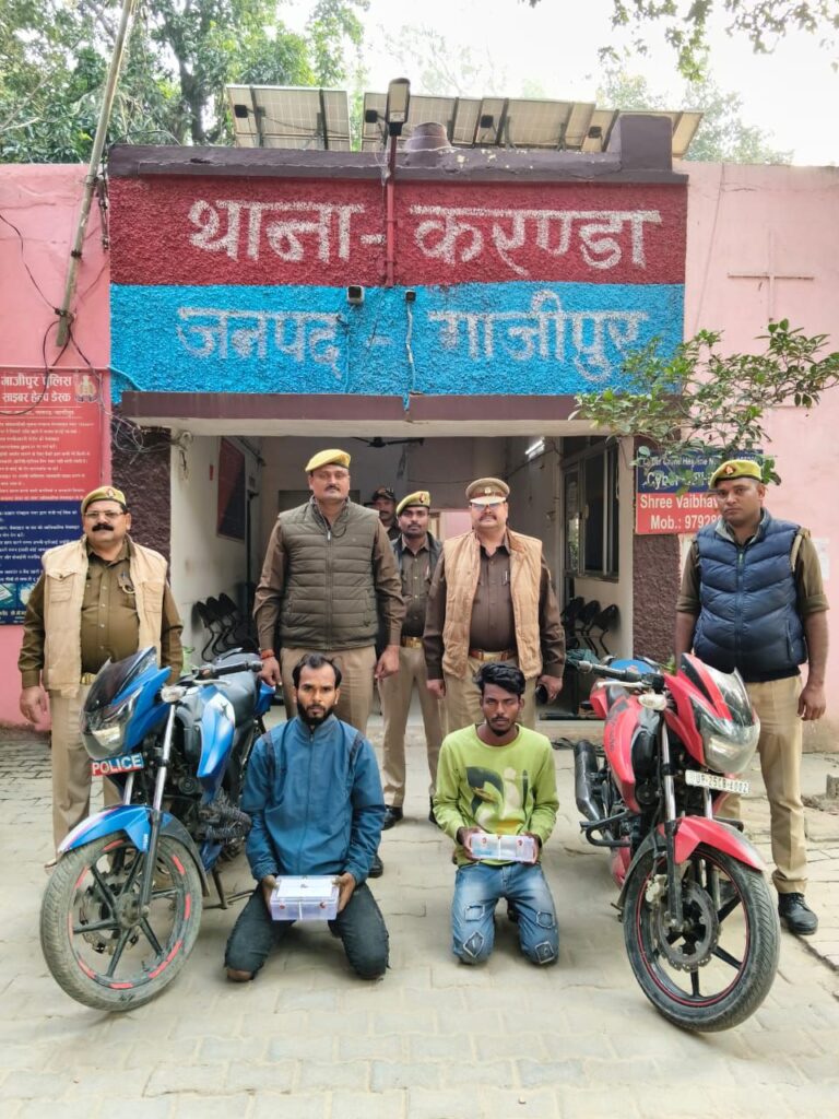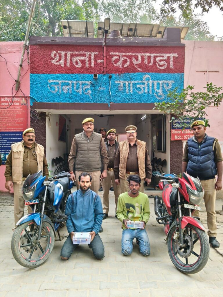 गाजीपुर। करण्डा थाना पुलिस ने अपराधियों के खिलाफ चलाई जा रही सख्त मुहिम के तहत एक और बड़ी सफलता हासिल की है। प्रभारी निरीक्षक राजनरायन की अगुवाई में बनी संयुक्त टीम ने थाना क्षेत्र के करकटपुर गंगा पुल के पास शानदार पुलिसिंग का परिचय देते हुए दो शातिर अपराधियों को चोरी की दो अपाची मोटरसाइकिल, एक अवैध देशी तमंचा .315 बोर, एक जिंदा कारतूस, दो मोबाइल फोन व 630 रूपए नकद के साथ रंगे हाथ गिरफ्तार कर लिया, जबकि उनके दो साथी मौके से भाग निकले।